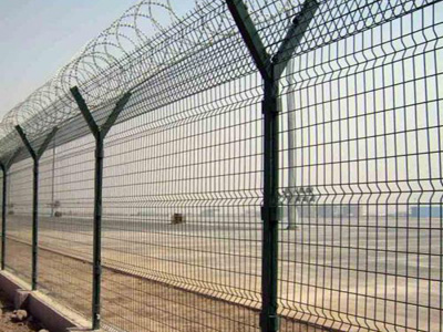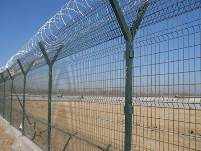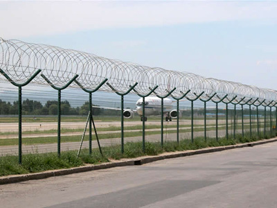 機場圍界又稱作“機場護欄”、“Y型安全防御護網”,它是由V型支架立拄,加強型焊接片網,安全防盜連接件和熱鍍鋅刀片刺籠組成是強度和安全防御性級別很高的隔離柵產品。近年來,被廣泛應用在機場,軍事基地等高安全場所。注:如果在機場護欄網頂部加裝刀片刺絲、刀片刺繩后又很好的增強了安全防護性能。